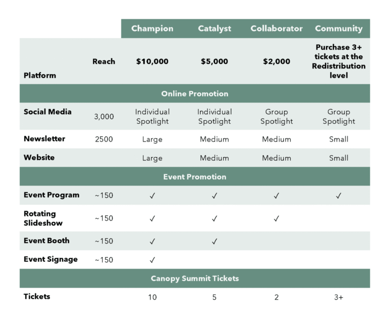 Sponsoring the Canopy Summit is an opportunity not only to gain exposure with attendees who are ready to enact change, but to also make a firm stand that your organization is committed to the thriving and well-being of our communities.